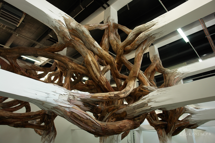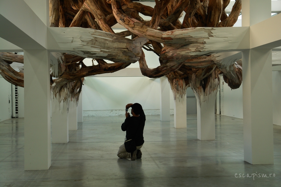 Noi ne-am plimbat printre stalpi de sustinere ce se transforma in copaci, in cadrul unei dintre cele mai suprarealiste si uimitoare expozitie la care am fost vreodata – Baitogogo, a lui Henrique Oliveira. Artistul brazilian s-a jucat efectiv cu arhitectura muzeului, formand un nod gordian din coloanele sale ce se metamorfozeaza din structuri de beton in materie organica. Am gasit si un Making of pe care-l recomandam: