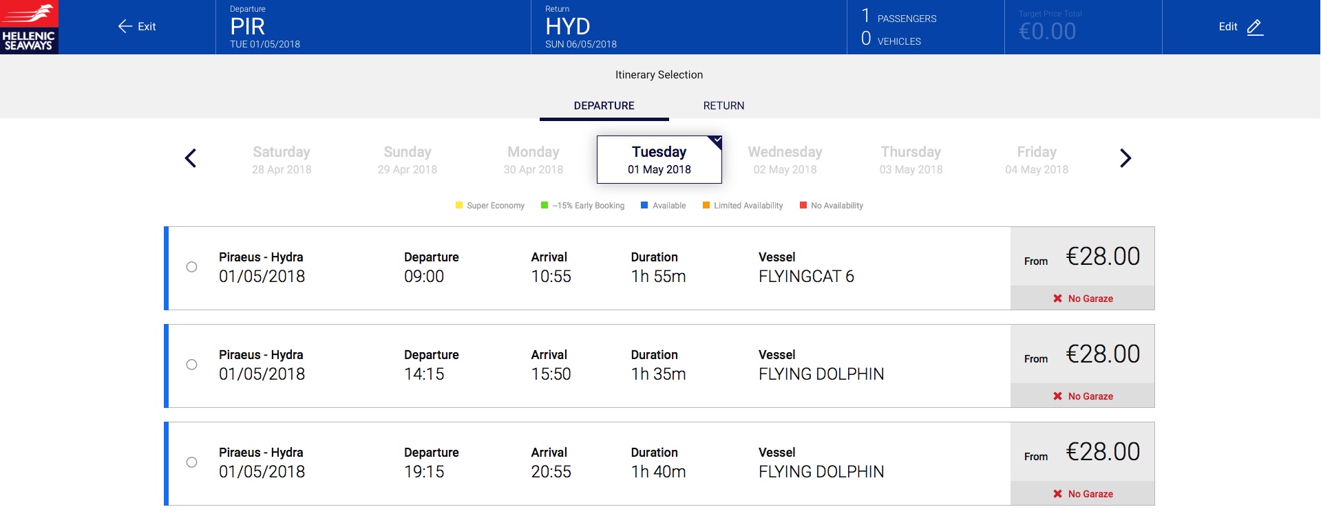 Un bilet costa 28 euro (doar dus, de persoana sau dublu dus-intors) indiferent de ora de plecare din Pireu: 09:00, 14:15 sau 19:15.